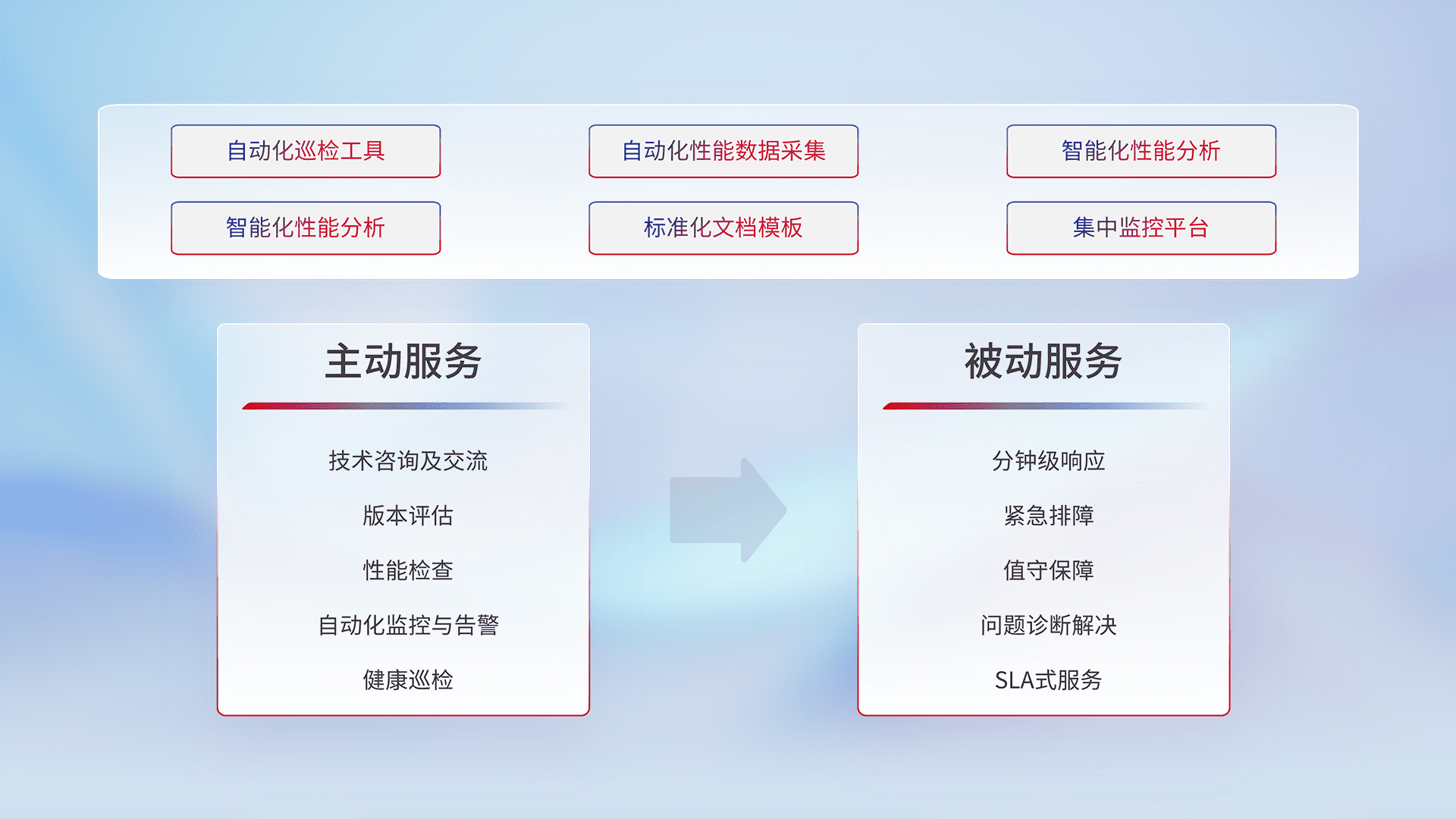 智能化工具和标准化文档,,保障服务质量,,提供主动服务(包含技术咨询、、版本评估、、性能检查、、自动化监控与告警、、健康巡检)和被动服务包含(分钟级响应、、紧急排障、、、值守保障、、、、问题诊断解决、、SLA服务)。。