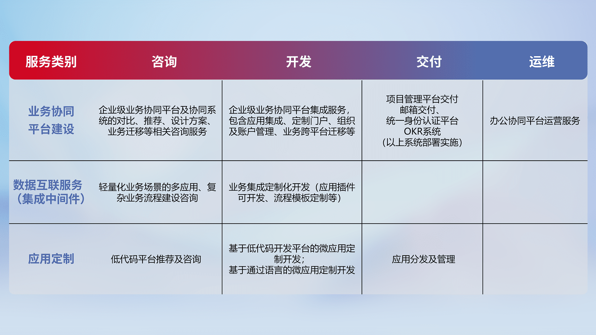 针对钉钉、、企微、、IDaas等平台级产品提供产品的规划、、、、方案、、、交付、、定制化开发等服务,,,,实现如统一协同办公、、、、智能客户服务、、、混合会议管理、、、、智能数据查询、、等业务场景,,,,实现数字化转型。。。